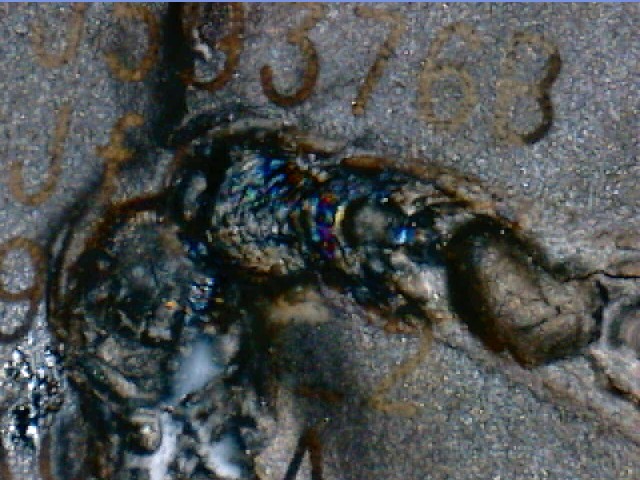 Facilement quelques centaines de degrés. En fait, ça dépend. Selon ce que l'on voit, c'est visible de la chaleur, mais il s'agit d'un arc électrique (lire court-circuit) pendant très uen fraction de seconde et c'est fini. Si en même temps une partie du circuit à fondu de façon à ce que le courant augmente rapidement, alors ça peut avoir chauffé suffisamment longtemps et dans une région suffisamment restreinte pour que la chaleur ne puisse être dissipée. On voit qu'une partie des soudures ont également fondues, ça implique, selon l'alliage étain/autre métal (le point de fusion de l'étain seul étant de 232oC), une température entre 180 et 250oC. Au fait, saviez-vous que le cuivre est soluble dans l'étain liquide