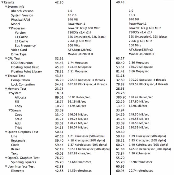 En cliquant ici vous allez pouvoir voir les résultats combinés de 2 benchmarks faits sur un iMac G3 600Mhz. Celui de gauche donne les résultats sur MacOS X 10.2.6, celui de droit sur Panther 7B21.